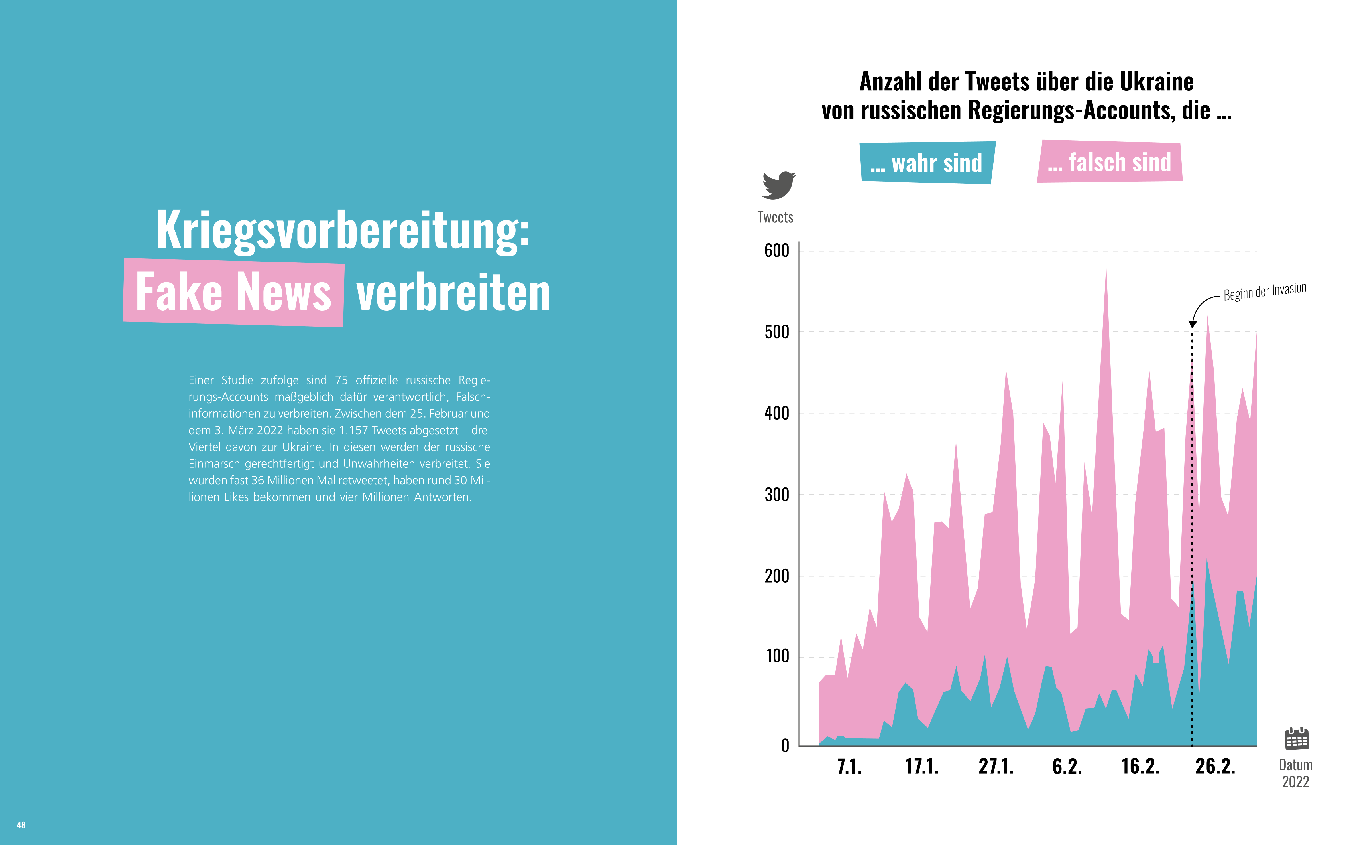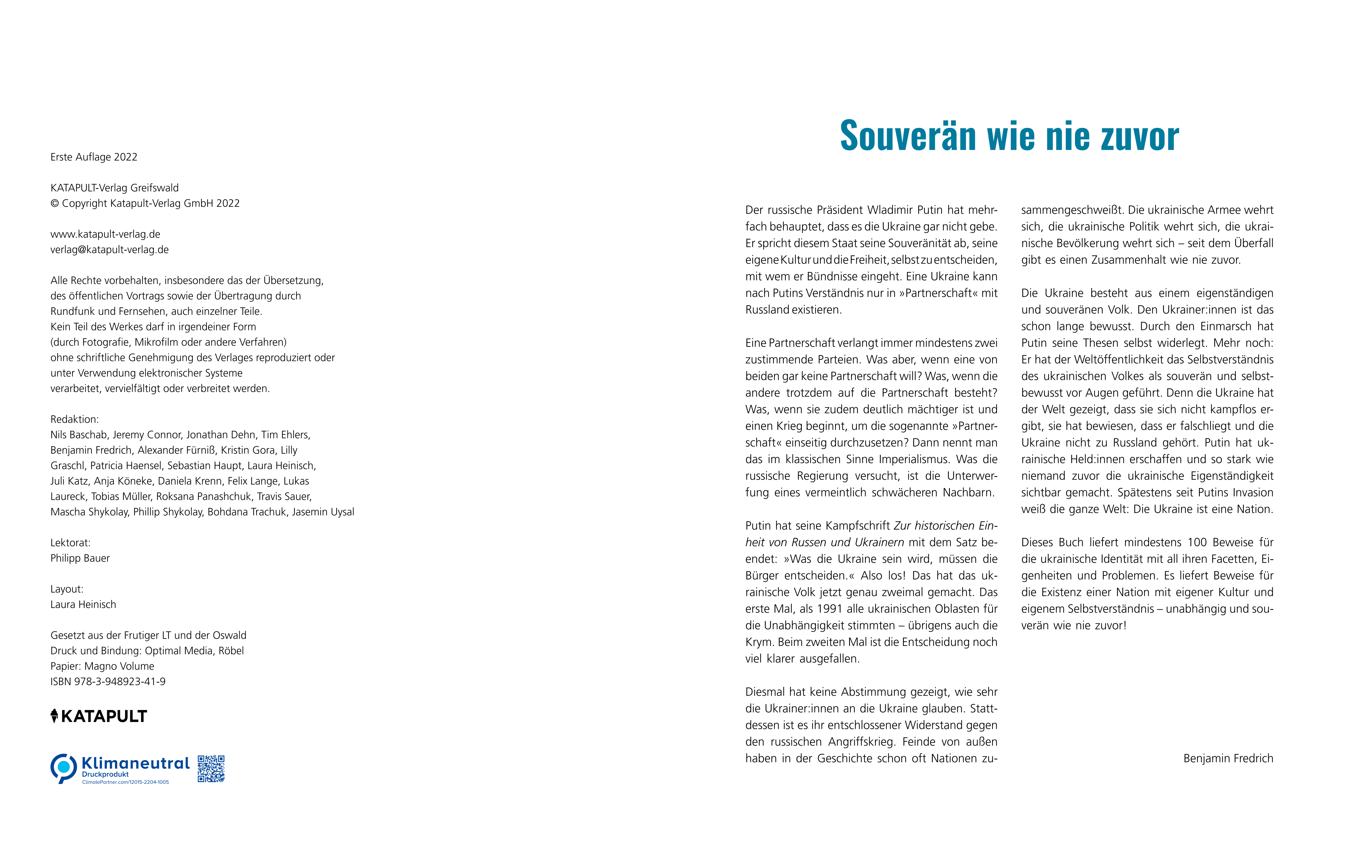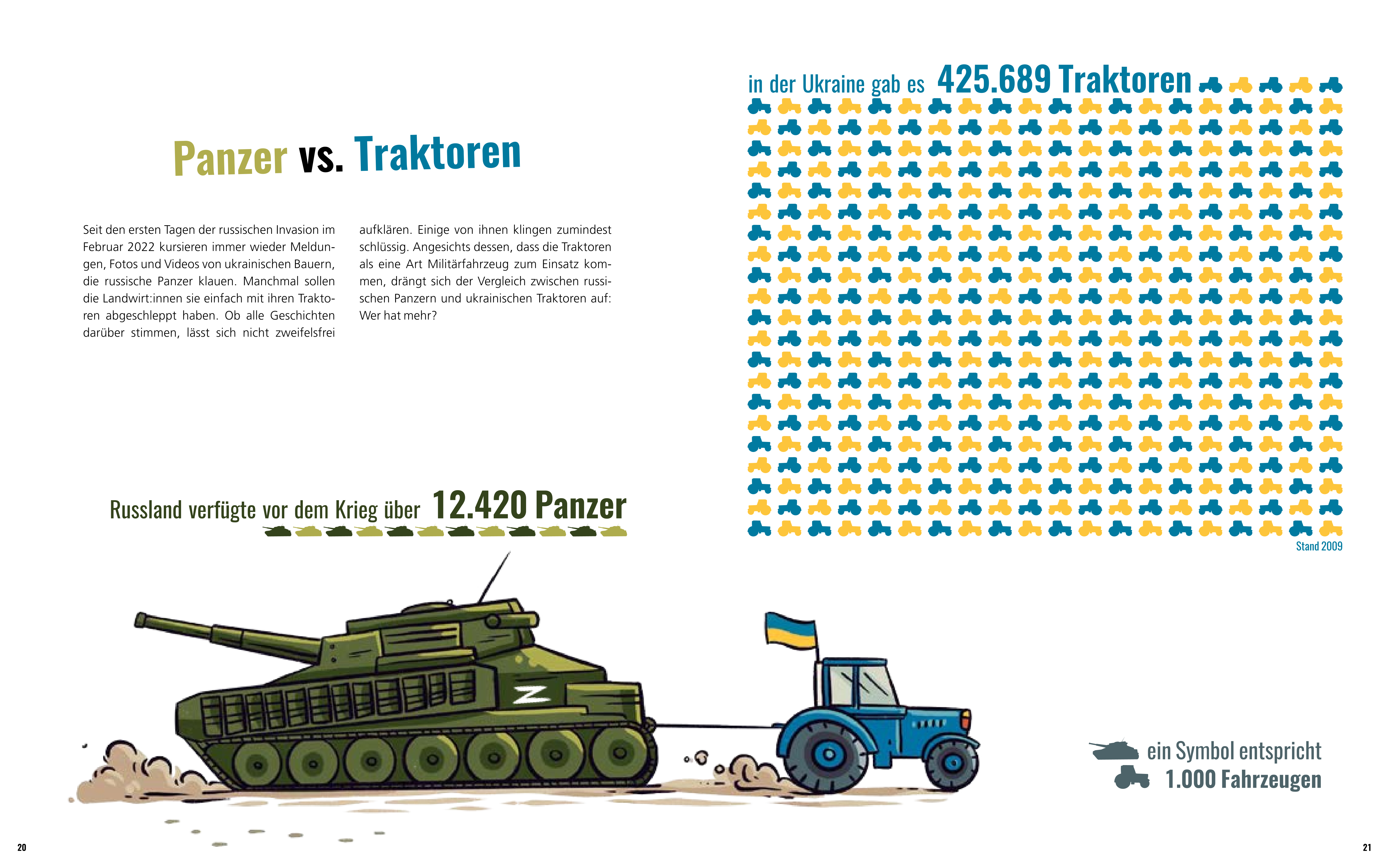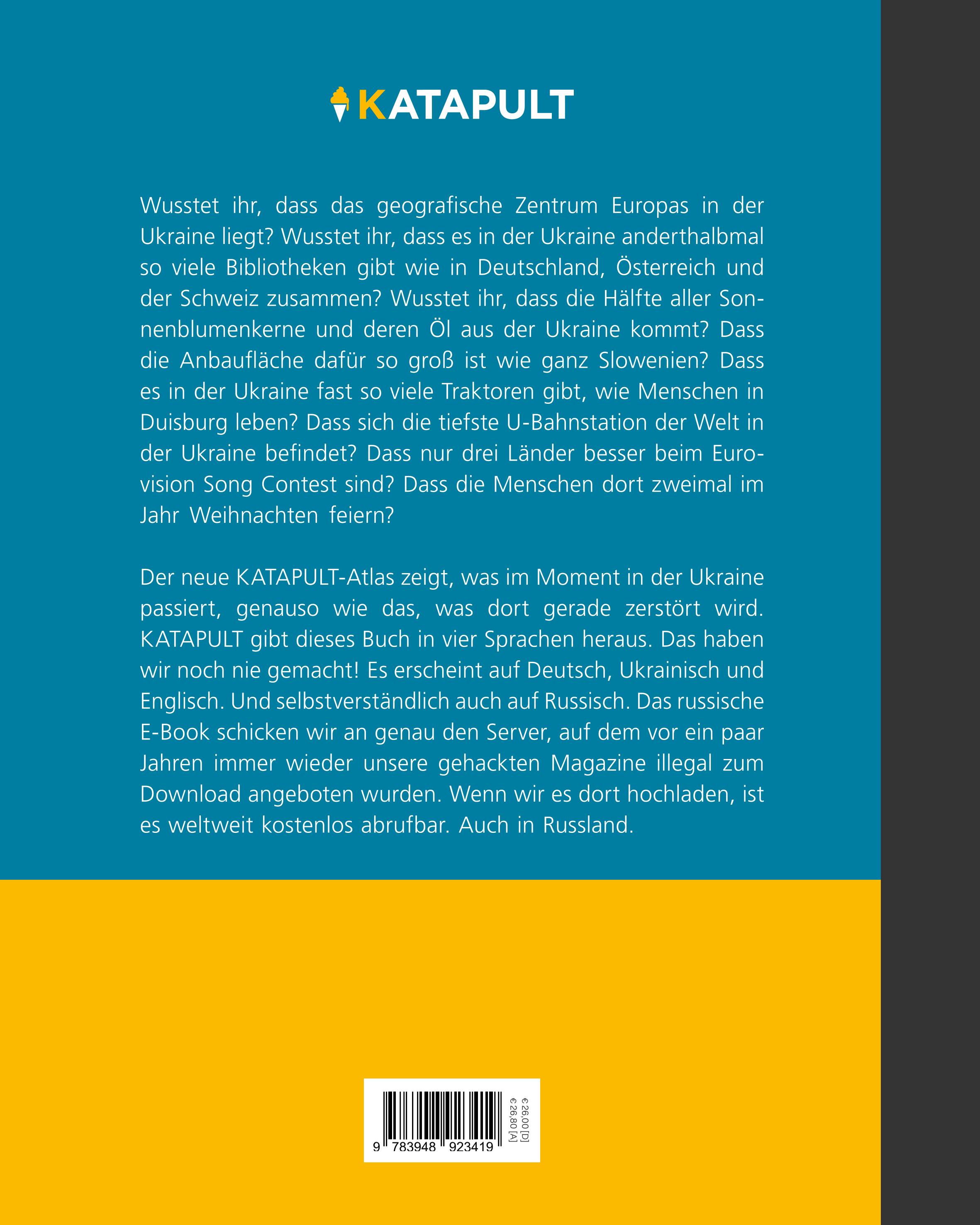 Wusstet ihr, dass das geografische Zentrum Europas in der Ukraine liegt? Wusstet ihr, dass es in der Ukraine anderthalbmal so viele Bibliotheken gibt wie in Deutschland, Österreich und der Schweiz zusammen? Wusstet ihr, dass die Hälfte aller Sonnenblumenkerne und deren Öl aus der Ukraine kommt? Dass die Anbaufläche dafür so groß ist wie ganz Litauen? Dass es in der Ukraine fast so viele Traktoren gibt, wie Menschen in Duisburg leben? Dass sich die tiefste U-Bahnstation der Welt in der Ukraine befindet? Dass nur drei Länder besser beim Eurovision Song Contest sind? Dass die Menschen dort zweimal im Jahr Weihnachten feiern? Der neue KATAPULT-Atlas zeigt, was im Moment in der Ukraine passiert, genauso wie das, was dort gerade zerstört wird. KATAPULT gibt dieses Buch in vier Sprachen heraus. Das haben wir noch nie gemacht! Es erscheint auf Deutsch, Ukrainisch und Englisch. Und selbstverständlich auch auf Russisch. Das russische E-Book schicken wir an genau den Server, auf dem vor ein paar Jahren immer wieder unsere gehackten Magazine illegal zum Download angeboten wurden. Wenn wir es dort hochladen, ist es weltweit kostenlos abrufbar. Auch in Russland.
