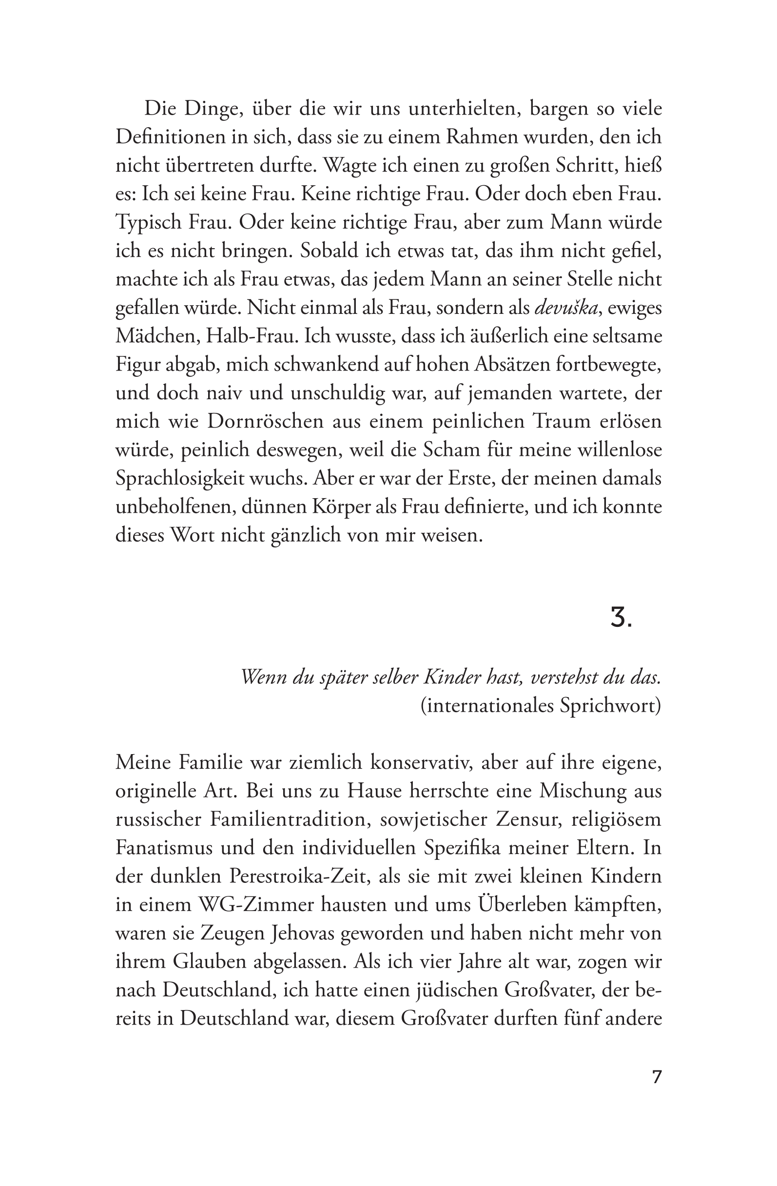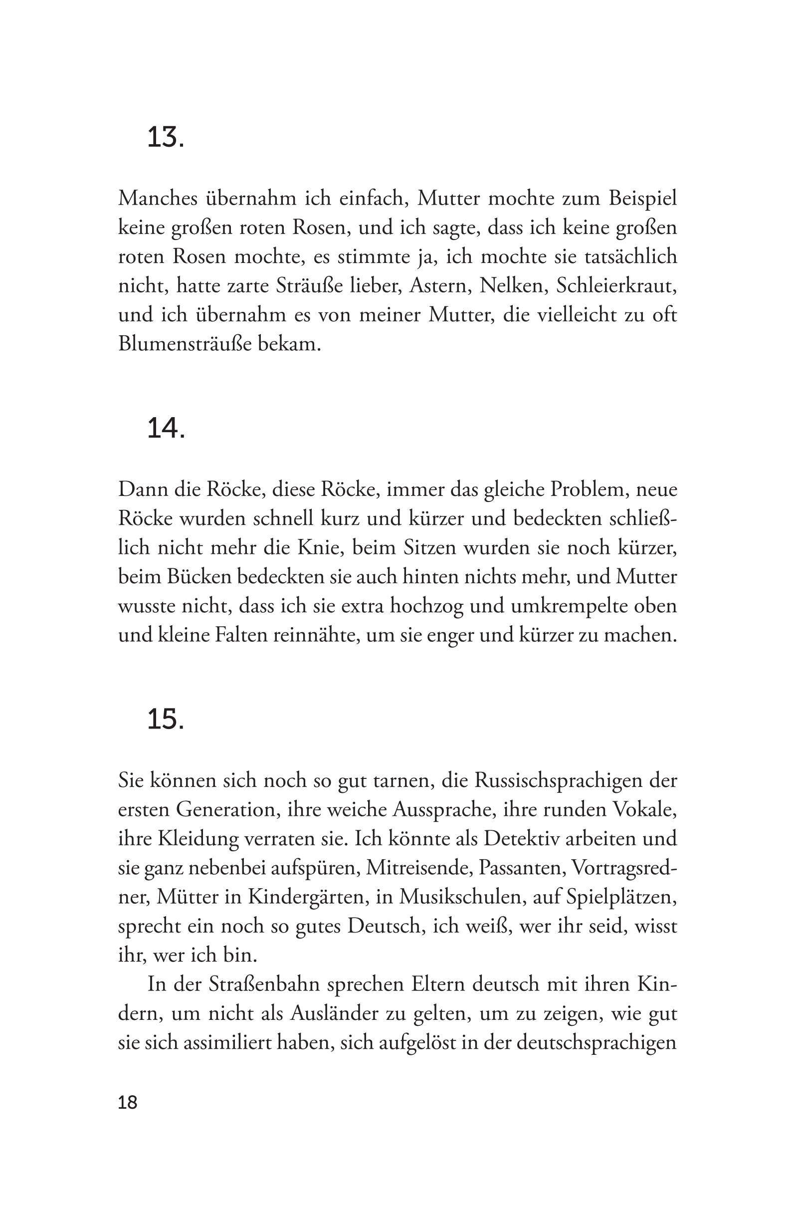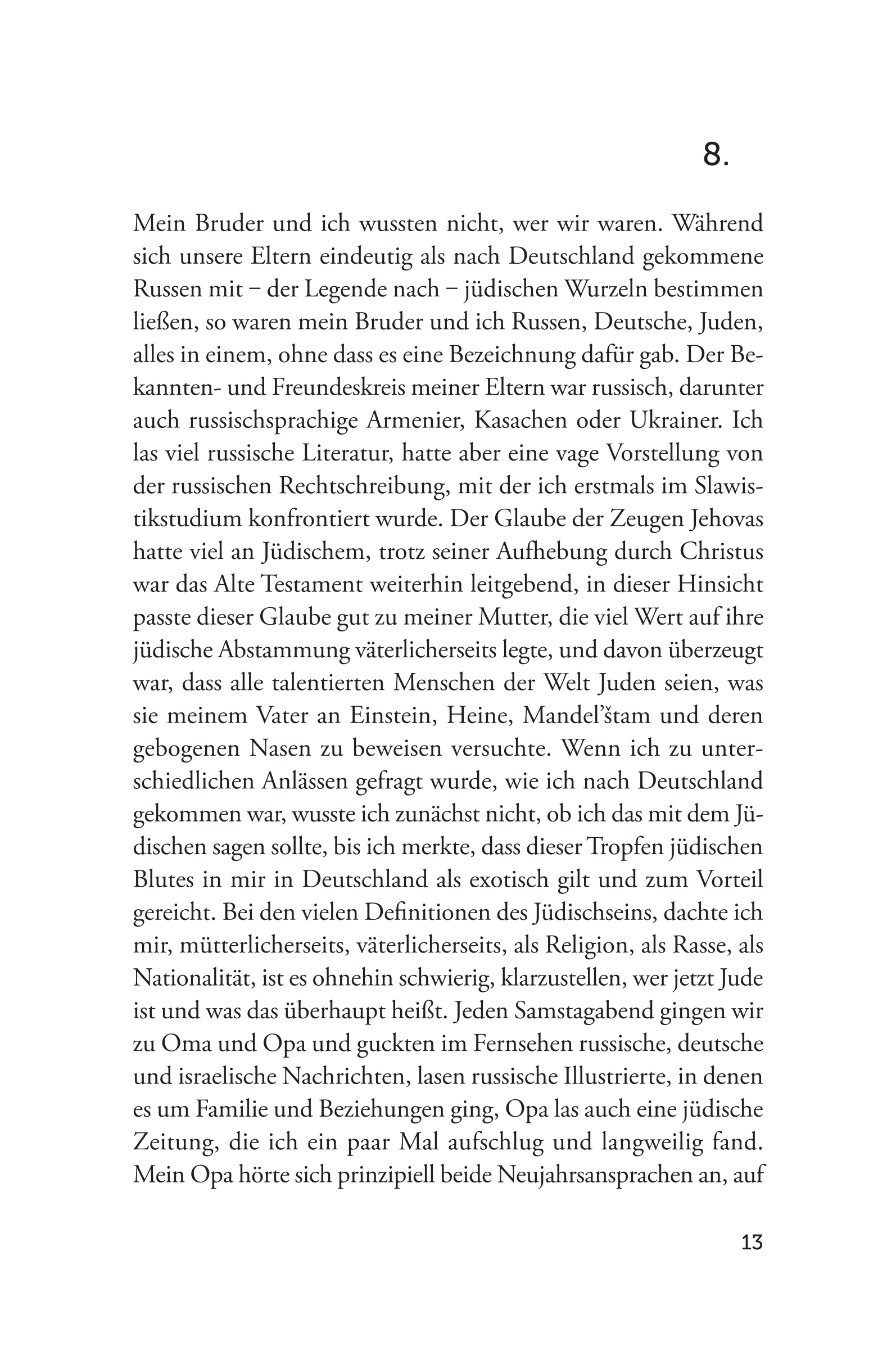 Ksenia ist Russin, sie ist Deutsche, sie ist Jüdin, sie ist unter Zeugen Jehovas aufgewachsen, sie ist eine junge Frau, Mutter, Schriftstellerin und Wissenschaftlerin, ist »dies, jenes und einiges in Querung« – und gleichzeitig ist sie nichts davon. Bei der Erforschung des eigenen Identitätspluralismus sammelt Ksenia Ebay-Anzeigen, die das Wort »russisch« enthalten, notiert Gespräche von Arbeitskolleg:innen, beobachtet russische Mütter in der Stadt und israelische Verwandte auf Facebook, dolmetscht in einer Psychotherapie für Flüchtlinge, erinnert sich immer wieder an einen traumatischen kindlichen Zustand von Orientierungslosigkeit und Fremdbestimmung, betastet misstrauisch ihren Körper und fragt sich nach einer Definition und dem Wert des eigenen Daseins.