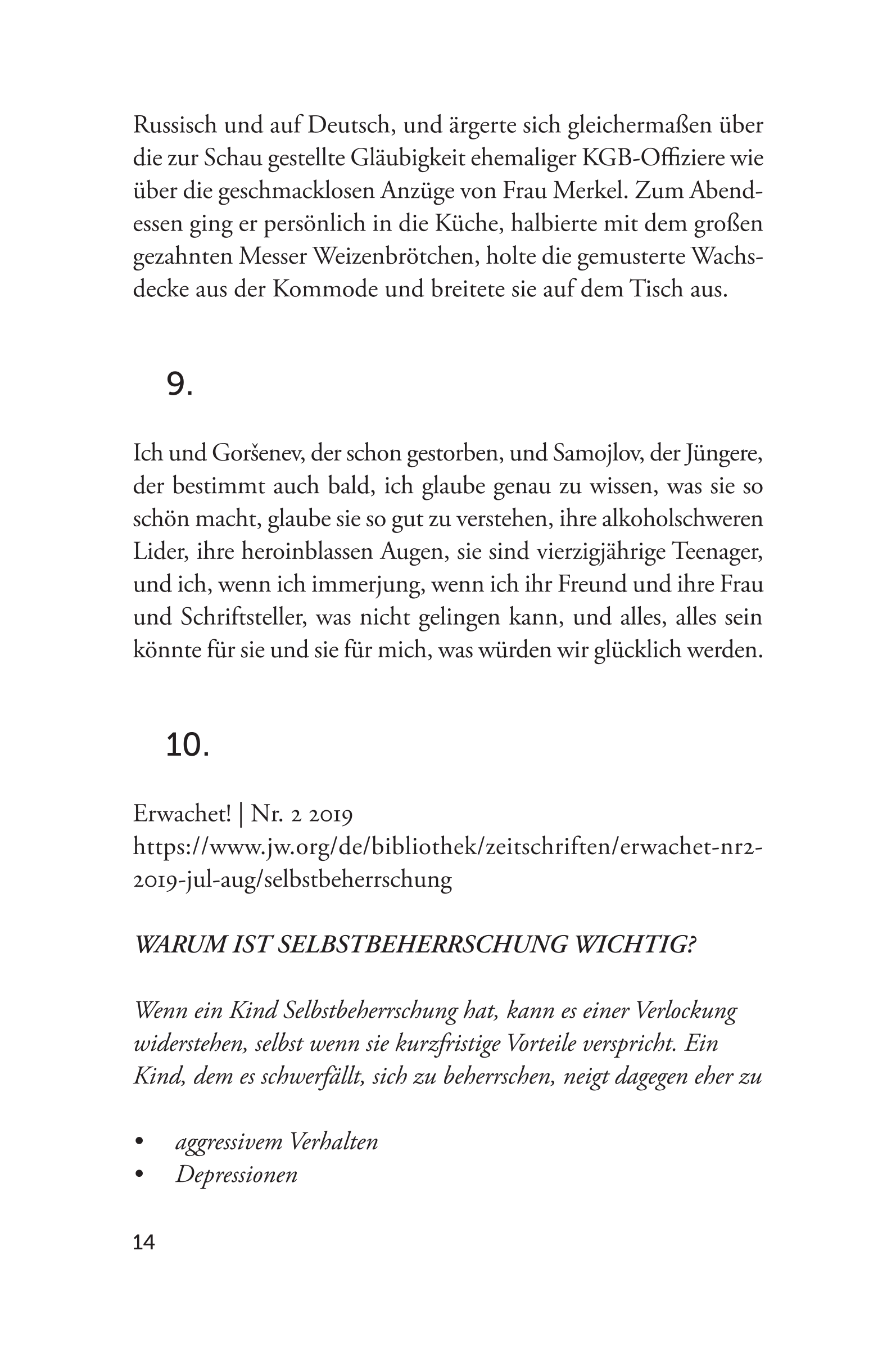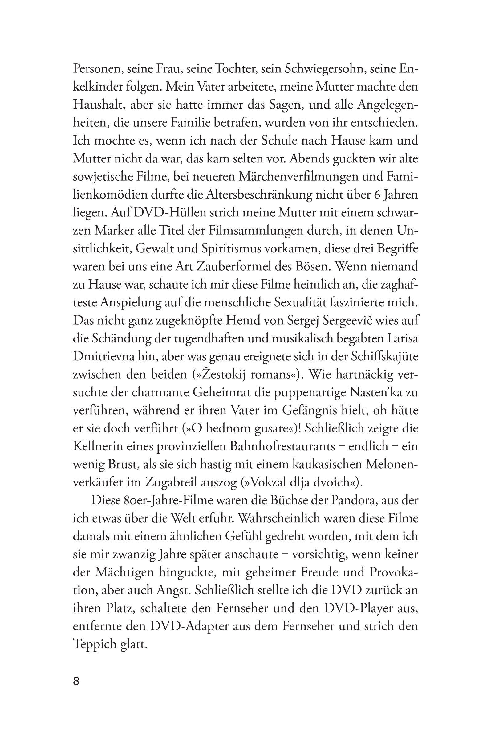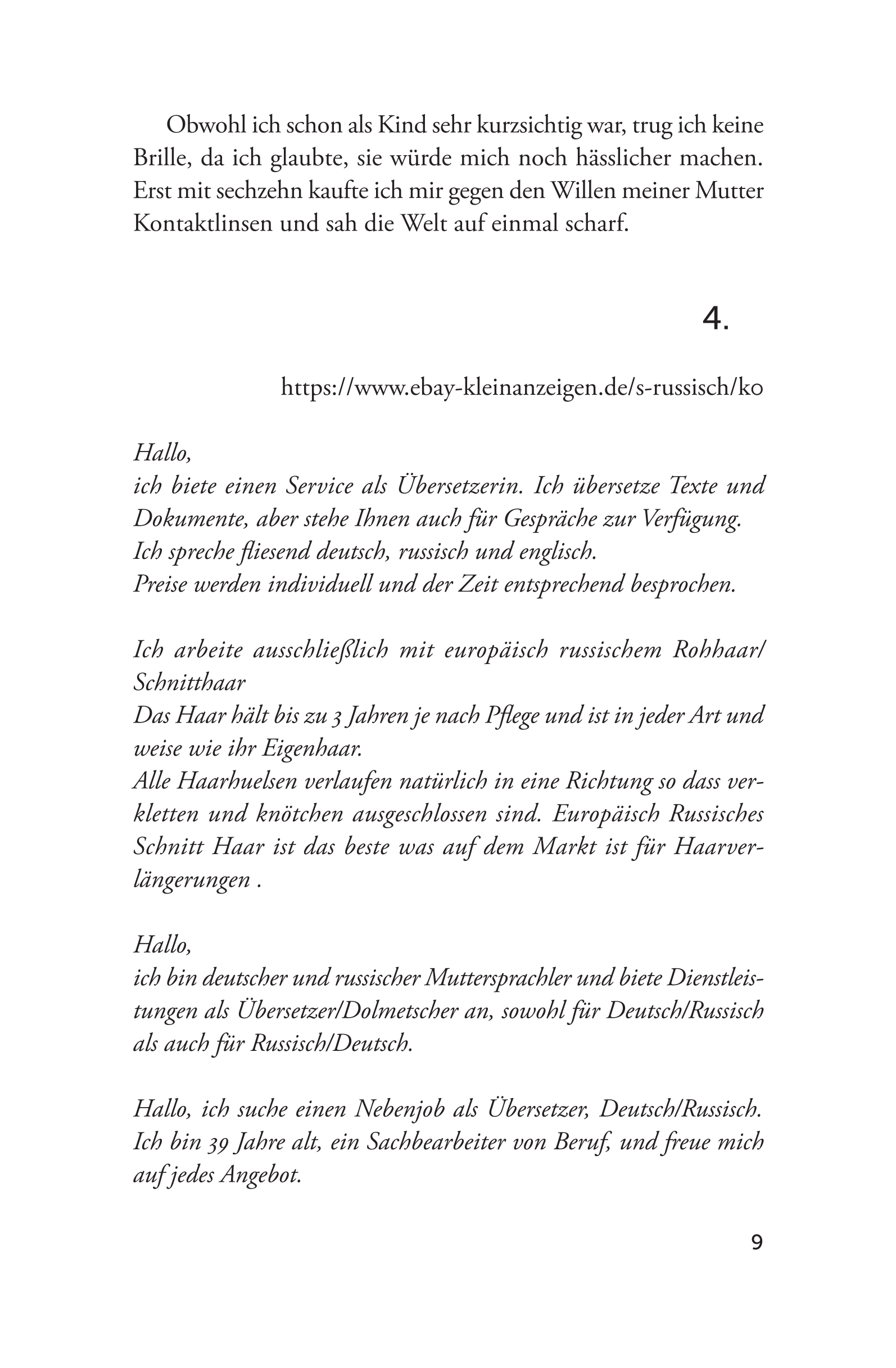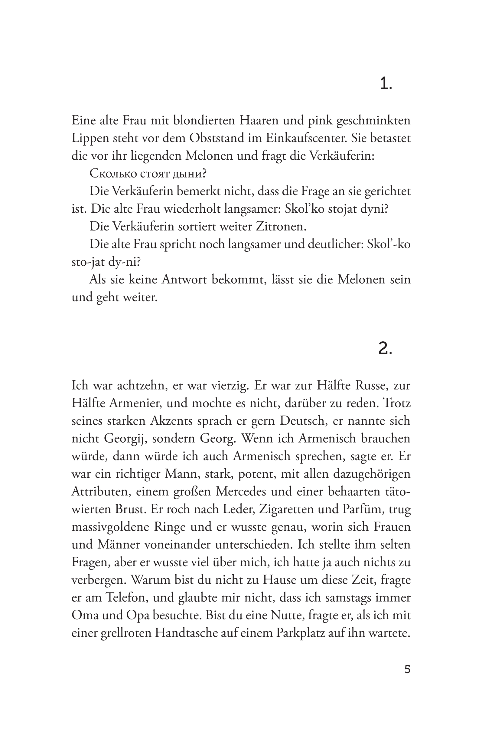 Ksenia ist Russin, sie ist Deutsche, sie ist Jüdin, sie ist unter Zeugen Jehovas aufgewachsen, sie ist eine junge Frau, Mutter, Schriftstellerin und Wissenschaftlerin, ist »dies, jenes und einiges in Querung« – und gleichzeitig ist sie nichts davon. Bei der Erforschung des eigenen Identitätspluralismus sammelt Ksenia Ebay-Anzeigen, die das Wort »russisch« enthalten, notiert Gespräche von Arbeitskolleg:innen, beobachtet russische Mütter in der Stadt und israelische Verwandte auf Facebook, dolmetscht in einer Psychotherapie für Flüchtlinge, erinnert sich immer wieder an einen traumatischen kindlichen Zustand von Orientierungslosigkeit und Fremdbestimmung, betastet misstrauisch ihren Körper und fragt sich nach einer Definition und dem Wert des eigenen Daseins.